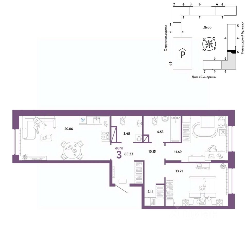 Продается 3комнатная квартира на 6 этаже от застройщика Страна Девелопмент. Площадь квартиры 65,23 кв. м.