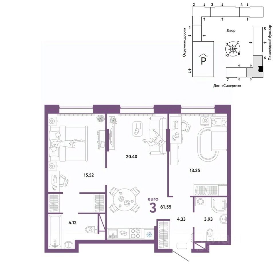Продается 3комнатная квартира на 7 этаже от застройщика Страна Девелопмент. Площадь квартиры 61,55 кв. м.