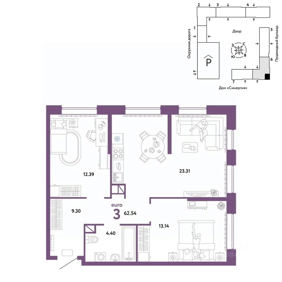 Продается 3комнатная квартира на 7 этаже от застройщика Страна Девелопмент. Площадь квартиры 62,54 кв. м.