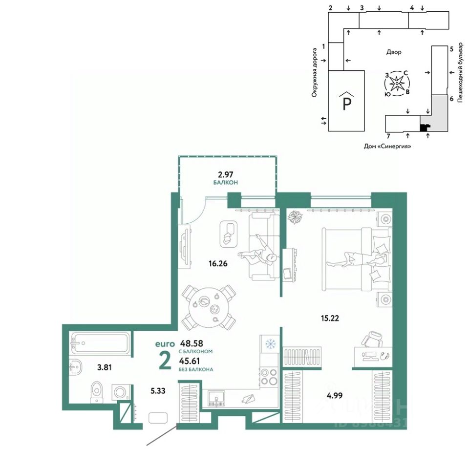 Продается 2комнатная квартира на 8 этаже от застройщика Страна Девелопмент. Площадь квартиры 48,58 кв. м.