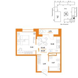 Продается 1комнатная квартира на 9 этаже от застройщика Страна Девелопмент. Площадь квартиры 33,48 кв. м.