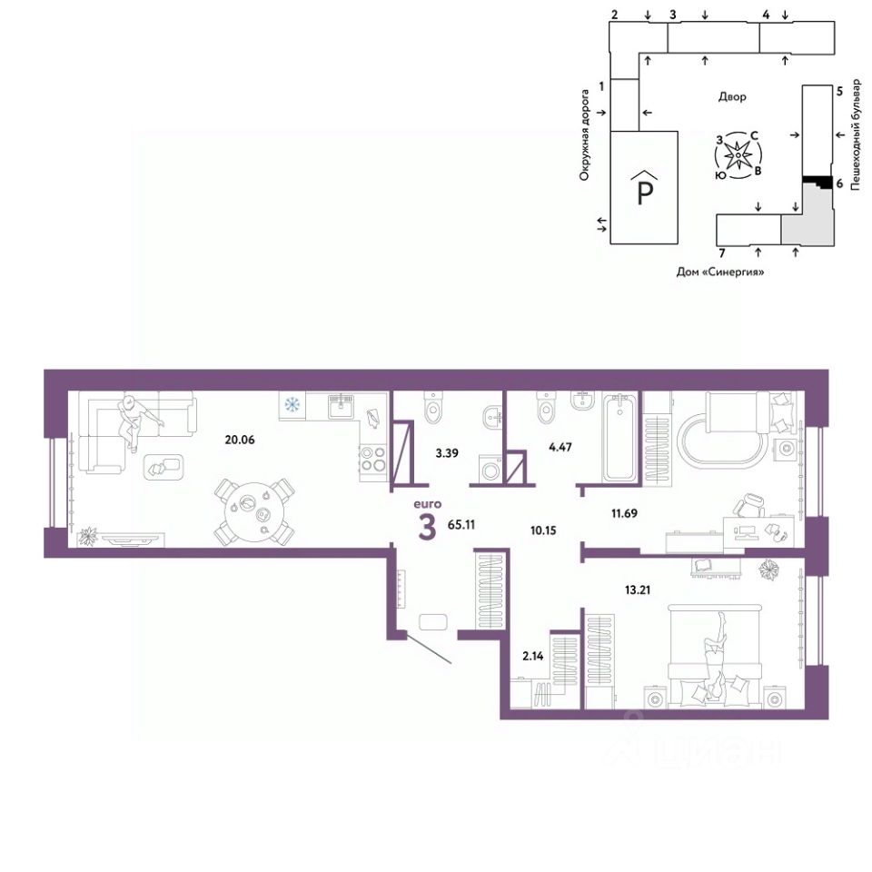 Продается 3комнатная квартира на 11 этаже от застройщика Страна Девелопмент. Площадь квартиры 65,11 кв. м.
