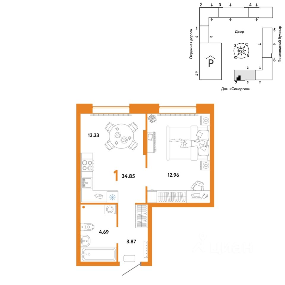 Продается 1комнатная квартира на 2 этаже от застройщика Страна Девелопмент. Площадь квартиры 34,85 кв. м.