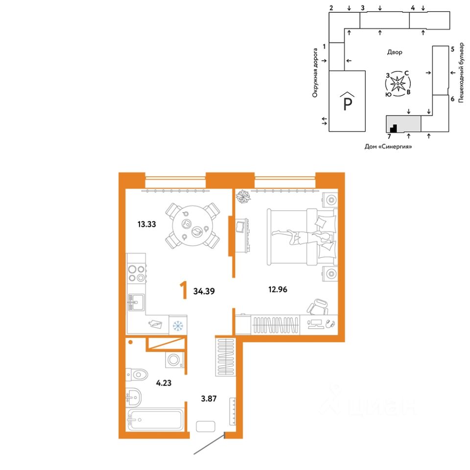 Продается 1комнатная квартира на 5 этаже от застройщика Страна Девелопмент. Площадь квартиры 34,39 кв. м.