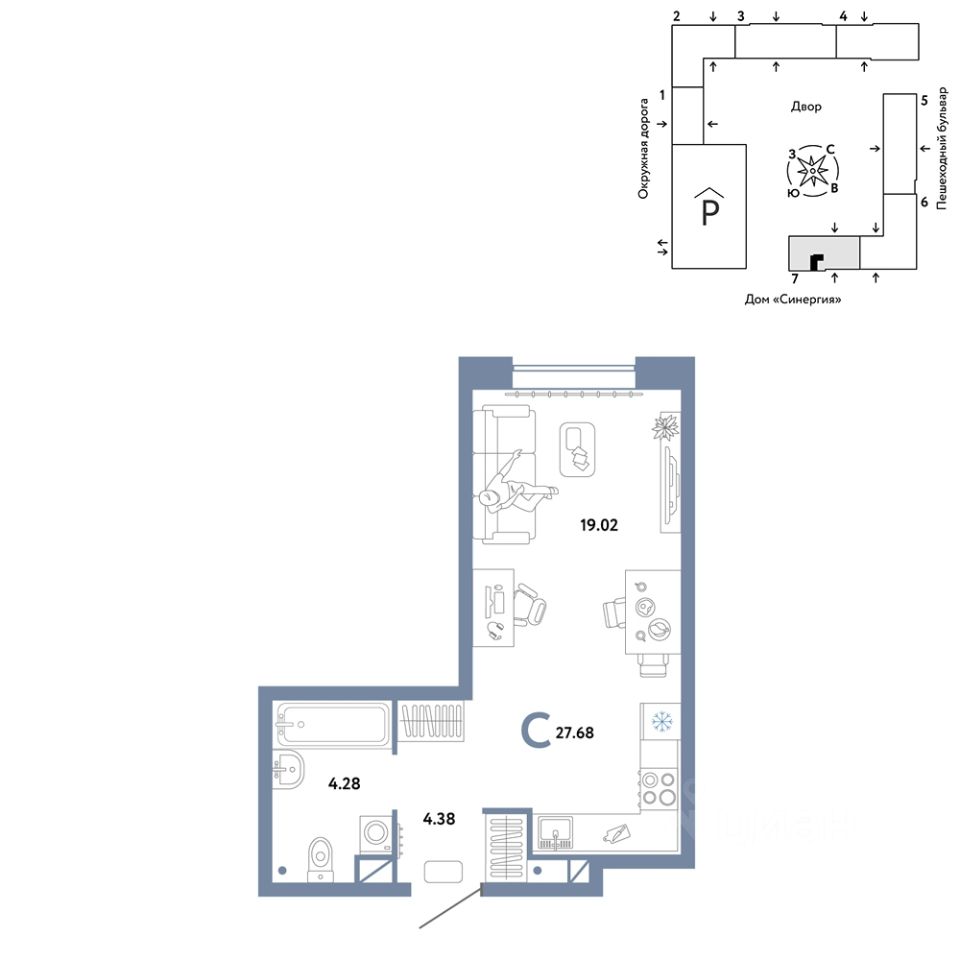 Продается студия на 5 этаже от застройщика Страна Девелопмент. Площадь квартиры 27,68 кв. м.