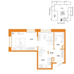 Продается 1комнатная квартира на 6 этаже от застройщика Страна Девелопмент. Площадь квартиры 37,45 кв. м.