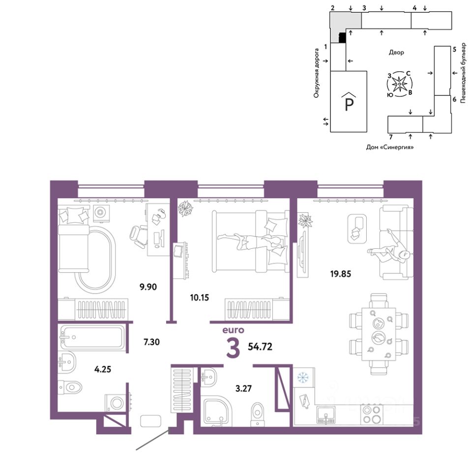 Продается 3комнатная квартира на 8 этаже от застройщика Страна Девелопмент. Площадь квартиры 54,72 кв. м.