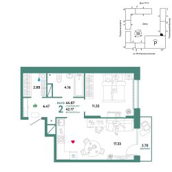 Продается 2комнатная квартира в новом ЖК "Юнион". Общая площадь квартиры 44,87 кв. м. Сдача — в 3 квартале 2024 года.