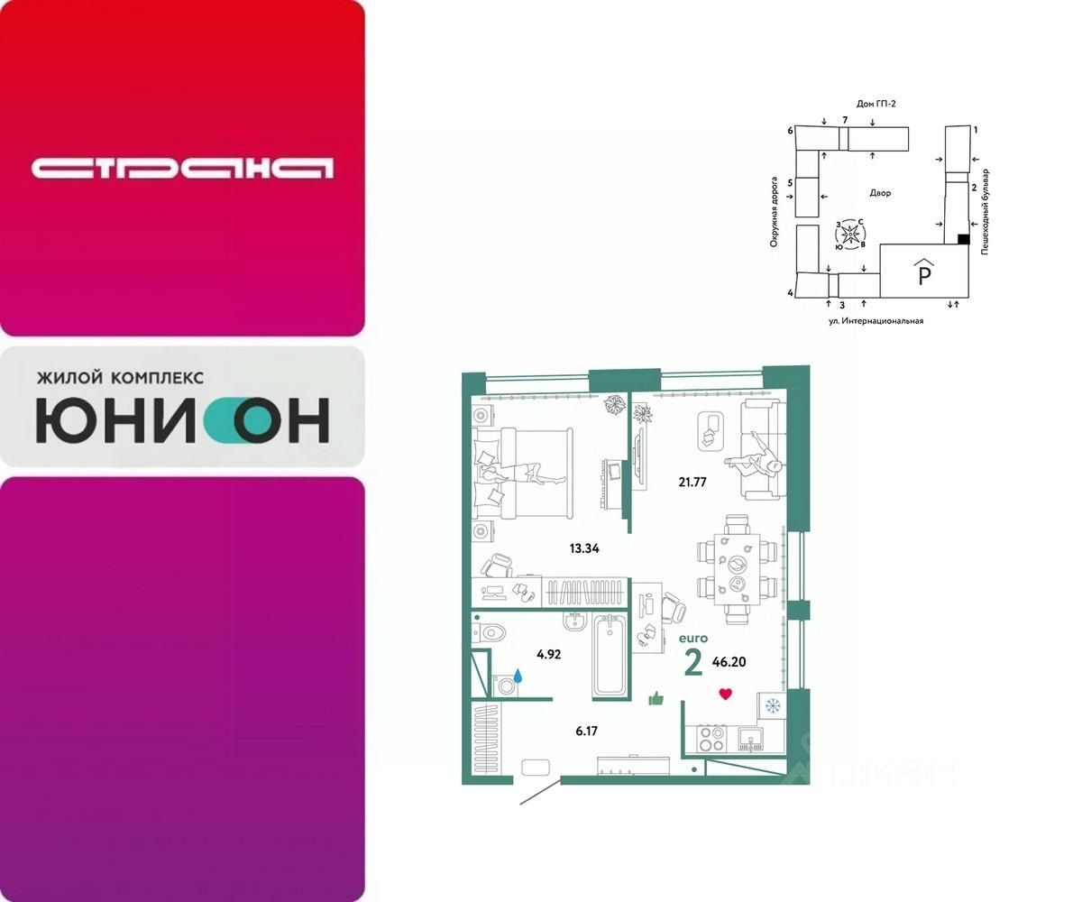 Продается 2комнатная квартира в новом ЖК "Юнион". Общая площадь квартиры 46,2 кв. м. Сдача — в 3 квартале 2024 года.