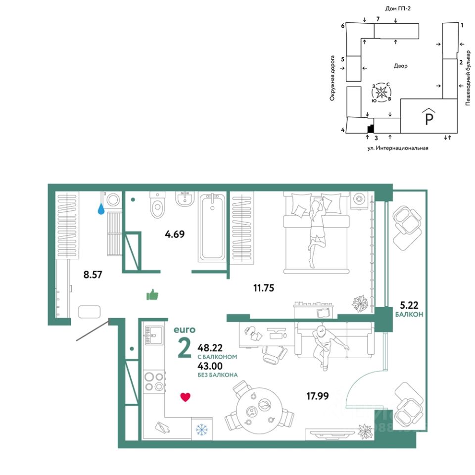 Продается 2комнатная квартира в новом ЖК "Юнион". Общая площадь квартиры 48,22 кв. м. Сдача — в 3 квартале 2024 года. Юнион - проект двух застройщиков всероссийского масштаба: Страны Девелопмент и Группы Эталон. Мы объединили опыт и компетенции в девелопменте, создании экологичной среды, разработке ландшафтного дизайна, коммерческой инфраструктуры и продуманных планировок. Результатом синергии станет комфортное пространство для жизни, отдыха и восстановления. Рядом два парка с хвойными и смешанными лесами — "Затюменский" и "Плехановский бор". Летом можно устраивать пикники, а зимой кататься по лыжным трассам. ОТДЕЛКА Квартиры сдаются с предчистовой отделкой. Все грязные работы выполнены: произведена разводка электричества и отопления; выполнена стяжка пола; стены выровнены "под маяк". В квартире установлены розетки, выключатели и радиаторы. На входе — надежная стальная дверь. Вам остается только выбрать материалы и начать ремонт Доступна опция "Ремонт от застройщика". Стоимость можно включить в ипотеку. Вы можете заказать один из трех цветовых вариантов: светлый, натуральный или тёмный. КУХНЯ С ТЕХНИКОЙ Теперь дополнительно к ремонту можно заказать кухню со встроенной техникой. Эргономику и функциональное наполнение разработали под каждую планировку. ПОЛНАЯ МЕБЛИРОВКА Больше не нужно тратить время даже на подбор, доставку и сборку мебели.Вы можете включить в стоимость квартиры с ремонтом полную меблировку. Что входит в меблировку? - Кухня с техникой и сантехникой - Диван - Кровать - Шкаф в спальне - Шкаф в прихожей Цены на квартиры указаны без учета скидок. На консультации менеджер подскажет, какие акции действуют, и как получить одобрение по ипотеке с низкой ставкой. Более подробная информация по телефону. Застройщик ООО СЗ "Страна-Эталон". Проектные декларации на сайте наш.дом.рф.