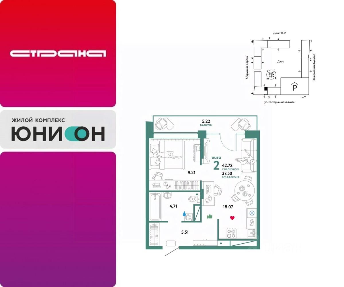 Продается 2комнатная квартира в новом ЖК "Юнион". Общая площадь квартиры 42,72 кв. м. Сдача — в 3 квартале 2024 года.