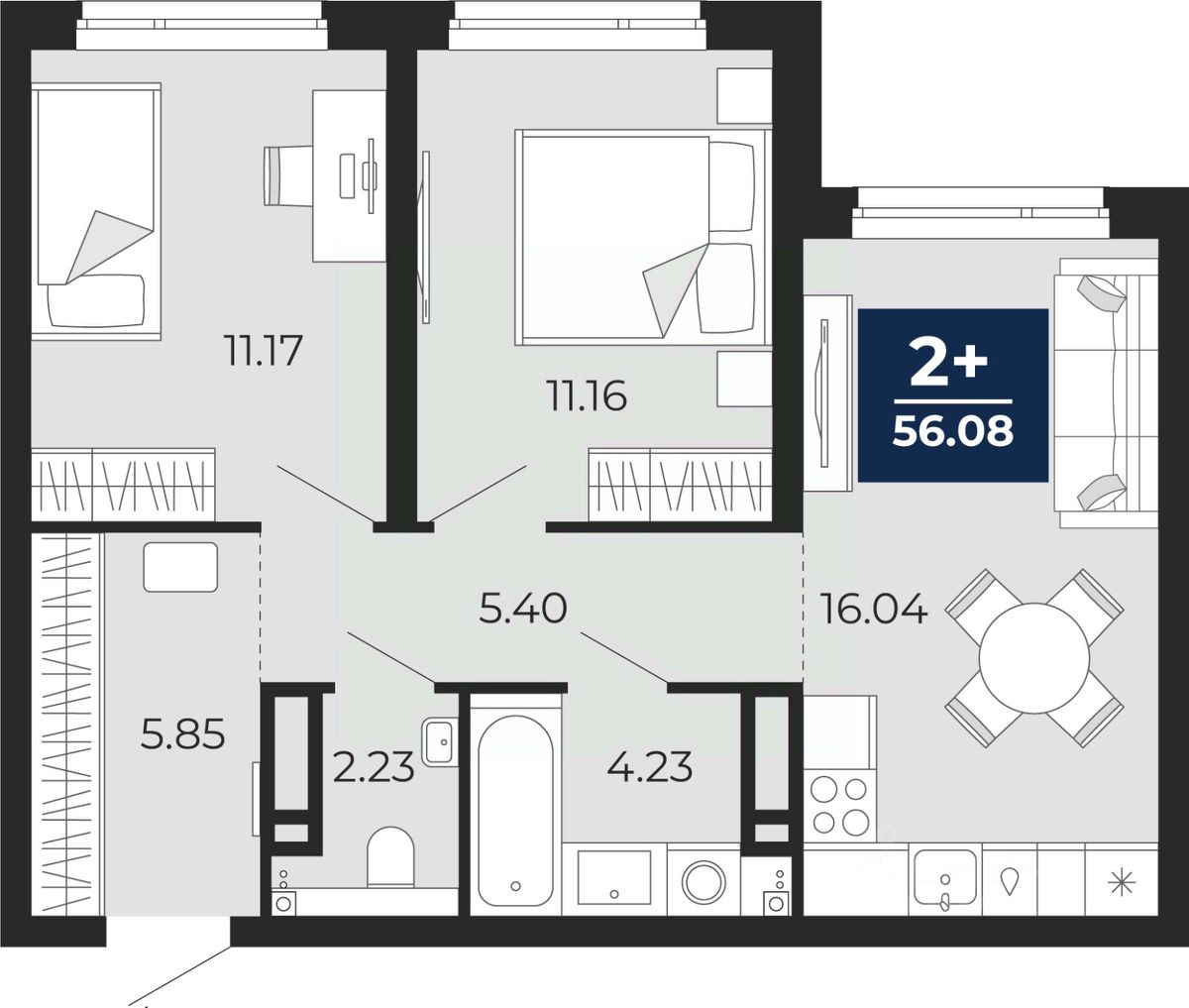 Двухкомнатная квартира с предчистовой отделкой в ЖК "Прео" на 5 этаже. Общая площадь: 56.08 кв.м., жилая: 22.33 кв.м., площадь просторной кухни-столовой: 16.04 кв.м. Комнаты изолированные, все окна выходят на одну сторону. В квартире один раздельный санузел. Высота потолков 2.7 м.