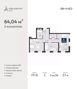 2-комн. квартира от застройщика с предчистовой отделкой в ЖК "Айвазовский City" на 2 этаже. Общая площадь: 64.04 кв.м., жилая: 24.29 кв.м., площадь просторной кухни-столовой: 16.28 кв.м. Квартира угловая, идеально подойдет любителям тишины и панорамных видов. В квартире одна лоджия, один совмещенный и один раздельный санузел. Высота потолков 2.7 м.
