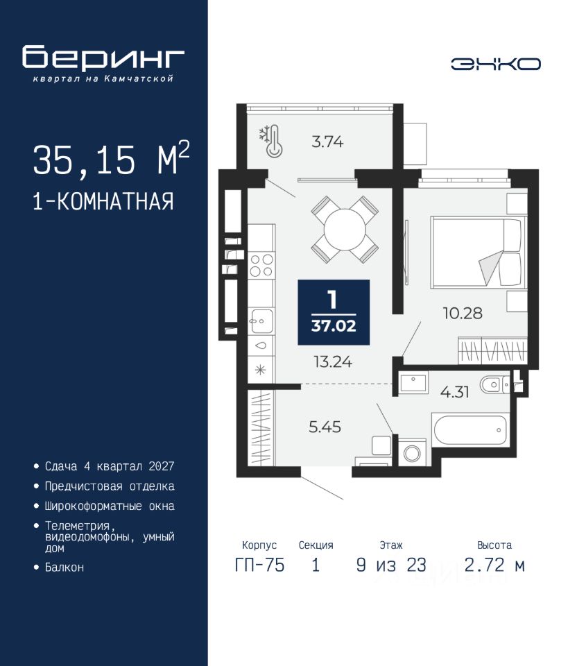 Продается однокомнатная квартира с предчистовой отделкой в ЖК "Беринг" на 9 этаже. Общая площадь: 35.15 кв.м., жилая: 10.28 кв.м., площадь просторной кухни-столовой: 13.24 кв.м. Все окна выходят на одну сторону. В квартире один балкон, один совмещенный санузел. Высота потолков 2.72 м.