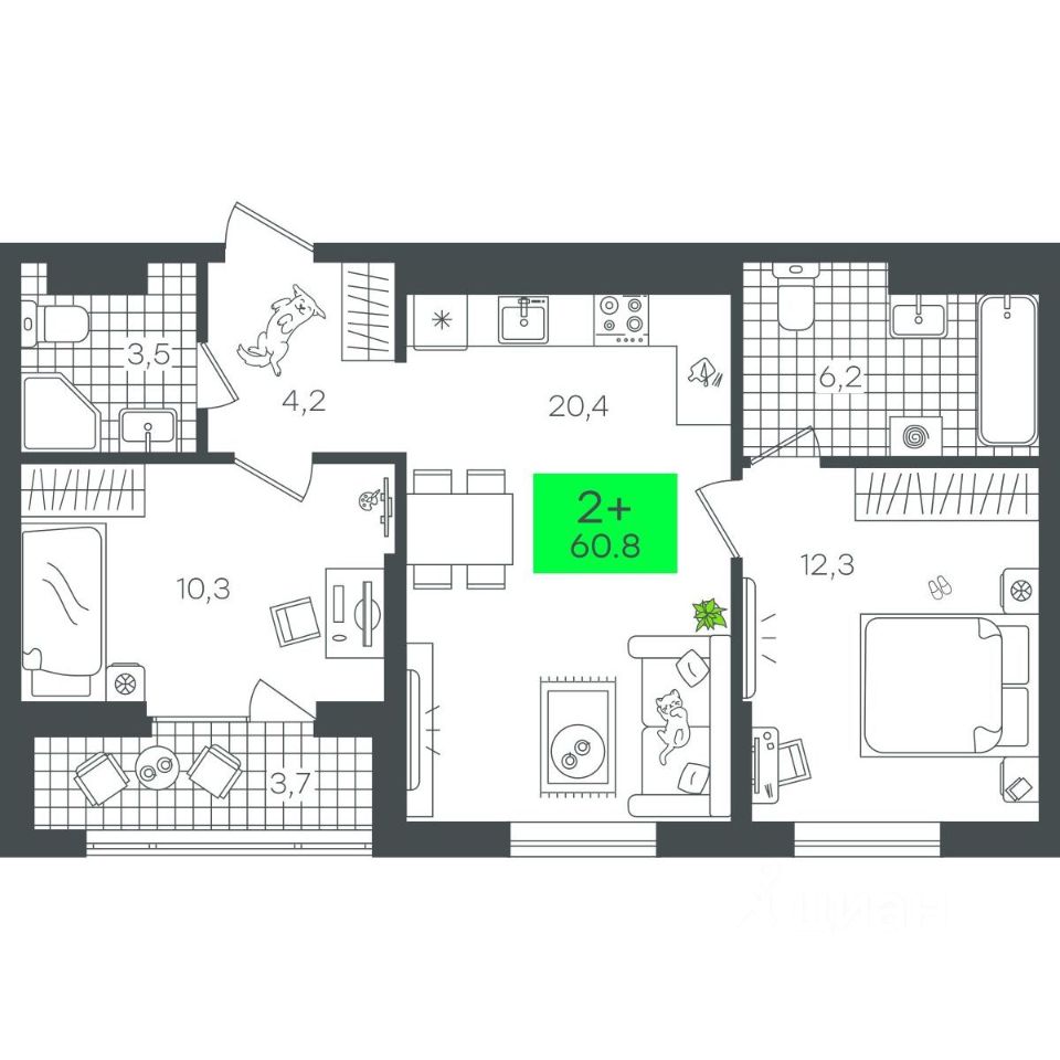 Продаётся 2-комнатная квартира в строящемся доме (Д4.1 (Малкова, 3)), срок сдачи: III-кв. 2026, общей площадью 60.88 кв.м., на 6 этаже. Компания 4D приступила к строительству нового жилого комплекса "Гранд квартал". Новый ЖК находится в зеленой зоне Калининского района, южнее микрорайона Тюменская слобода.