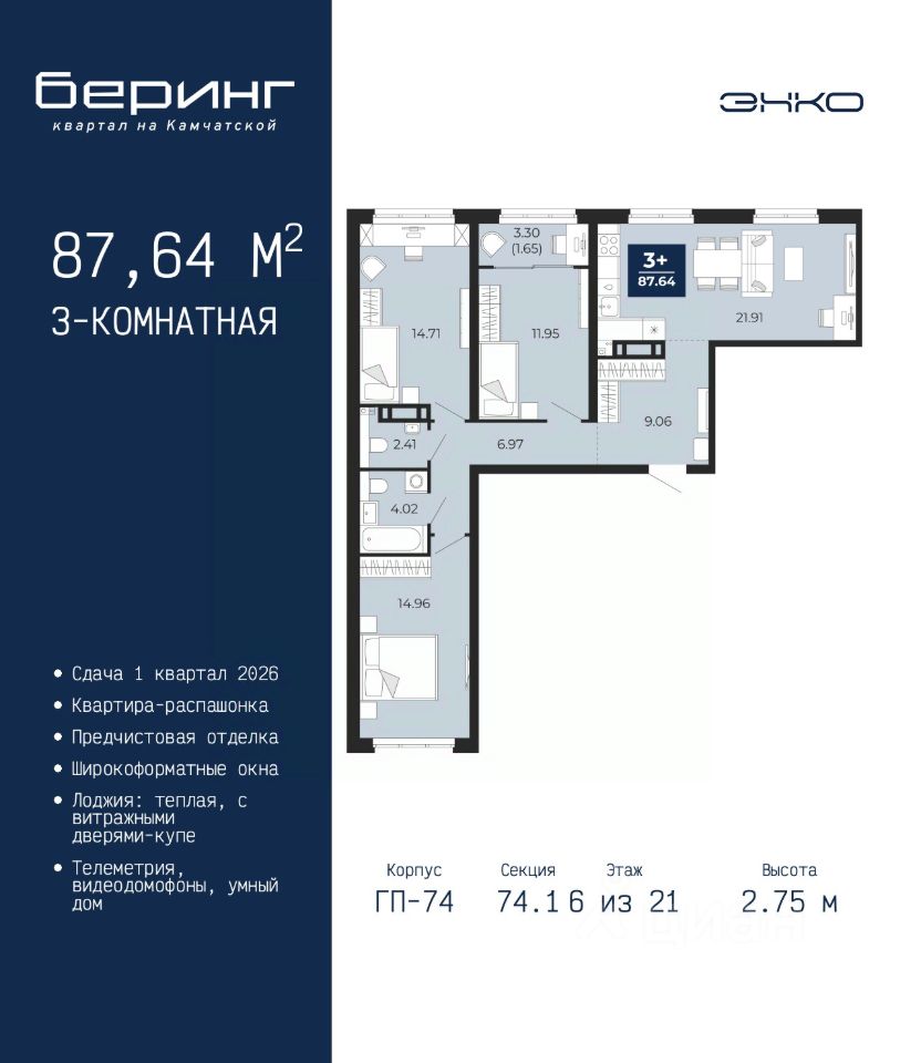 Просторная 3-комн. квартира с предчистовой отделкой в ЖК "Беринг" на 6 этаже. Общая площадь: 87.64 кв.м., жилая: 41.62 кв.м., площадь просторной кухни-столовой: 21.91 кв.м. Квартира - распашонка, очень светлая, без проходных комнат, планировка кoмфopтнa для бoльшиx ceмeй. В квартире одна лоджия, один совмещенный и один раздельный санузел. Высота потолков 2.75 м.