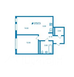 Прекрасная планировка: просторная кухня-гостиная (19 м²) и уютная спальня с нишей под шкаф. Совмещенный санузел с ванной.