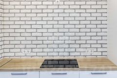 В кухне белый кухонный гарнитур со встроенной варочной панелью, также есть холодильник.
