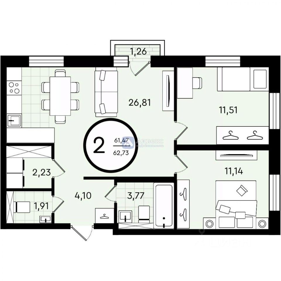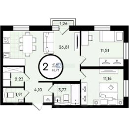 Предлагается к продаже уютная 2-комнатная квартира в доме жилого комплекса Зеленые аллеи. Площадь квартиры составляет 62.73 кв.м. Представленное жилье находится на третьем этаже. Квартира имеет две изолированные комнаты правильной геометрической формы и кухню-гостиную площадью 26.81 кв.м., которая станет центром притяжения для всех членов семьи. Планировка квартиры предусматривает два санузла, которые создадут повседневный комфорт, и гардеробную. Дополнительным пространством станет лоджия, на которой вы будете любоваться рассветами и закатами с чашечкой ароматного кофе.