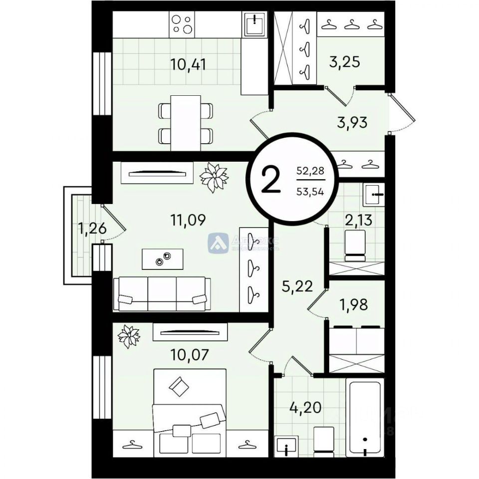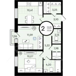 Предлагается к продаже уютная 2-комнатная квартира в доме жилого комплекса Зеленые аллеи. Площадь квартиры составляет 53,54 кв.м. Представленное жилье находится на втором этаже. Квартира имеет две изолированные комнаты правильной геометрической формы площадью 11,09 кв.м. и 11,07 кв.м. и кухню площадью 10,41 кв.м. Планировка квартиры предусматривает два санузла, которые создадут повседневный комфорт, гардеробную смежную с прихожей, и постирочную. Дополнительным пространством станет лоджия, на которой вы будете любоваться рассветами и закатами с чашечкой ароматного кофе.