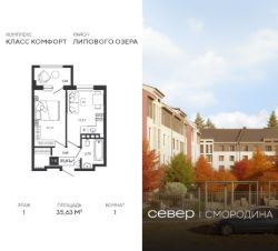 Продаётся квартира площадью 35.63 м2 в жилом комплексе "Смородина". Квартира находится на 1 этаже, жилая площадь квартиры 11.11 м2, площадь просторной кухни — 11.15 м2. Среди особенностей планировки — изолированные комнаты с окнами на одну сторону, 1 совмещённый санузел.
