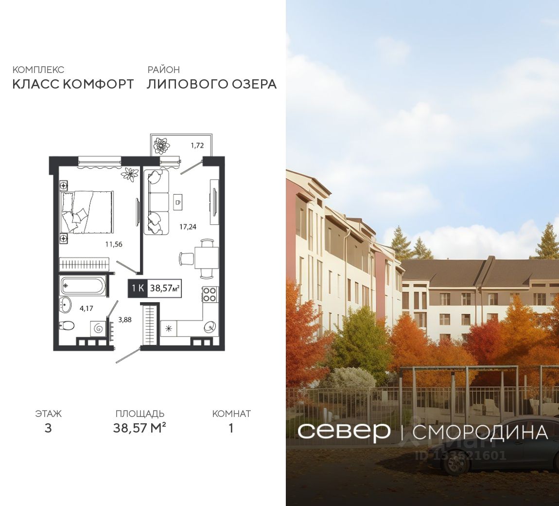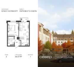 Продаётся квартира площадью 38.57 м2 в жилом комплексе "Смородина". Квартира находится на 3 этаже, жилая площадь квартиры 11.56 м2, площадь просторной кухни — 17.24 м2. Среди особенностей планировки — изолированные комнаты с окнами на одну сторону, 1 совмещённый санузел.