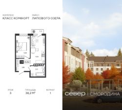 Продаётся квартира площадью 38.2 м2 в жилом комплексе "Смородина". Квартира находится на 3 этаже, жилая площадь квартиры 10.83 м2, площадь просторной кухни — 14.36 м2. Среди особенностей планировки — изолированные комнаты с окнами на одну сторону, 1 совмещённый санузел.