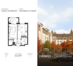 Продаётся квартира площадью 35.63 м2 в жилом комплексе "Смородина". Квартира находится на 3 этаже, жилая площадь квартиры 11.11 м2, площадь просторной кухни — 11.15 м2. Среди особенностей планировки — изолированные комнаты с окнами на одну сторону, 1 совмещённый санузел.