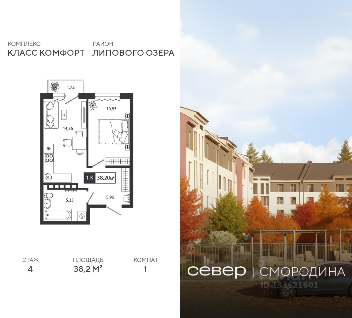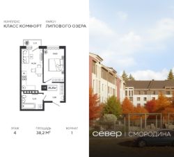 Продаётся квартира площадью 38.2 м2 в жилом комплексе "Смородина". Квартира находится на 4 этаже, жилая площадь квартиры 10.83 м2, площадь просторной кухни — 14.36 м2. Среди особенностей планировки — изолированные комнаты с окнами на одну сторону, 1 совмещённый санузел.