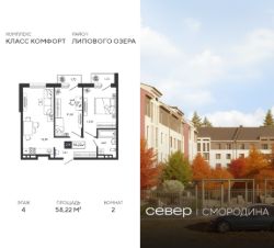 Продаётся квартира площадью 58.22 м2 в жилом комплексе "Смородина". Квартира находится на 4 этаже, жилая площадь квартиры 24.87 м2, площадь просторной кухни — 18.39 м2. Среди особенностей планировки — изолированные комнаты с окнами на одну сторону, 1 совмещённый санузел.