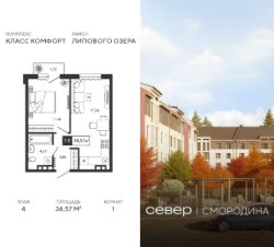 Продаётся квартира площадью 38.57 м2 в жилом комплексе "Смородина". Квартира находится на 4 этаже, жилая площадь квартиры 11.56 м2, площадь просторной кухни — 17.24 м2. Среди особенностей планировки — изолированные комнаты с окнами на одну сторону, 1 совмещённый санузел.