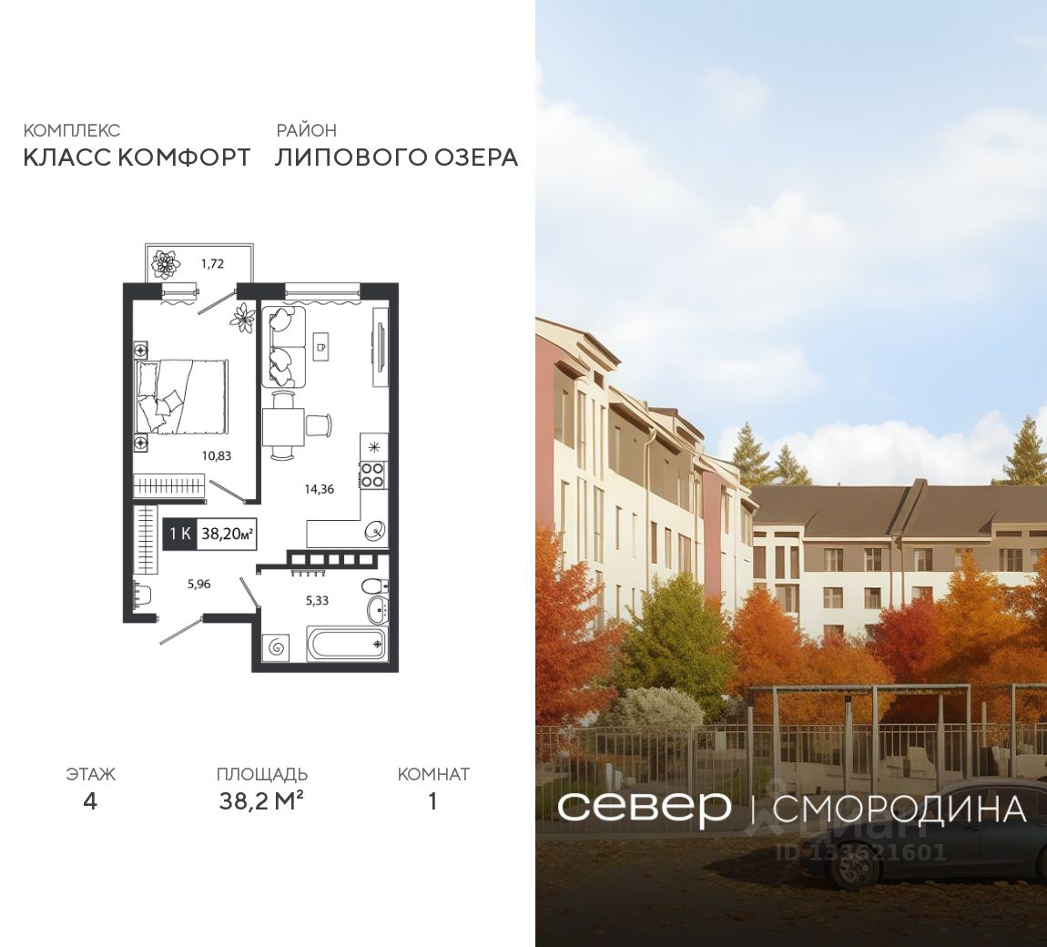 Продаётся квартира площадью 38.2 м2 в жилом комплексе "Смородина". Квартира находится на 4 этаже, жилая площадь квартиры 10.83 м2, площадь просторной кухни — 14.36 м2. Среди особенностей планировки — изолированные комнаты с окнами на одну сторону, 1 совмещённый санузел.