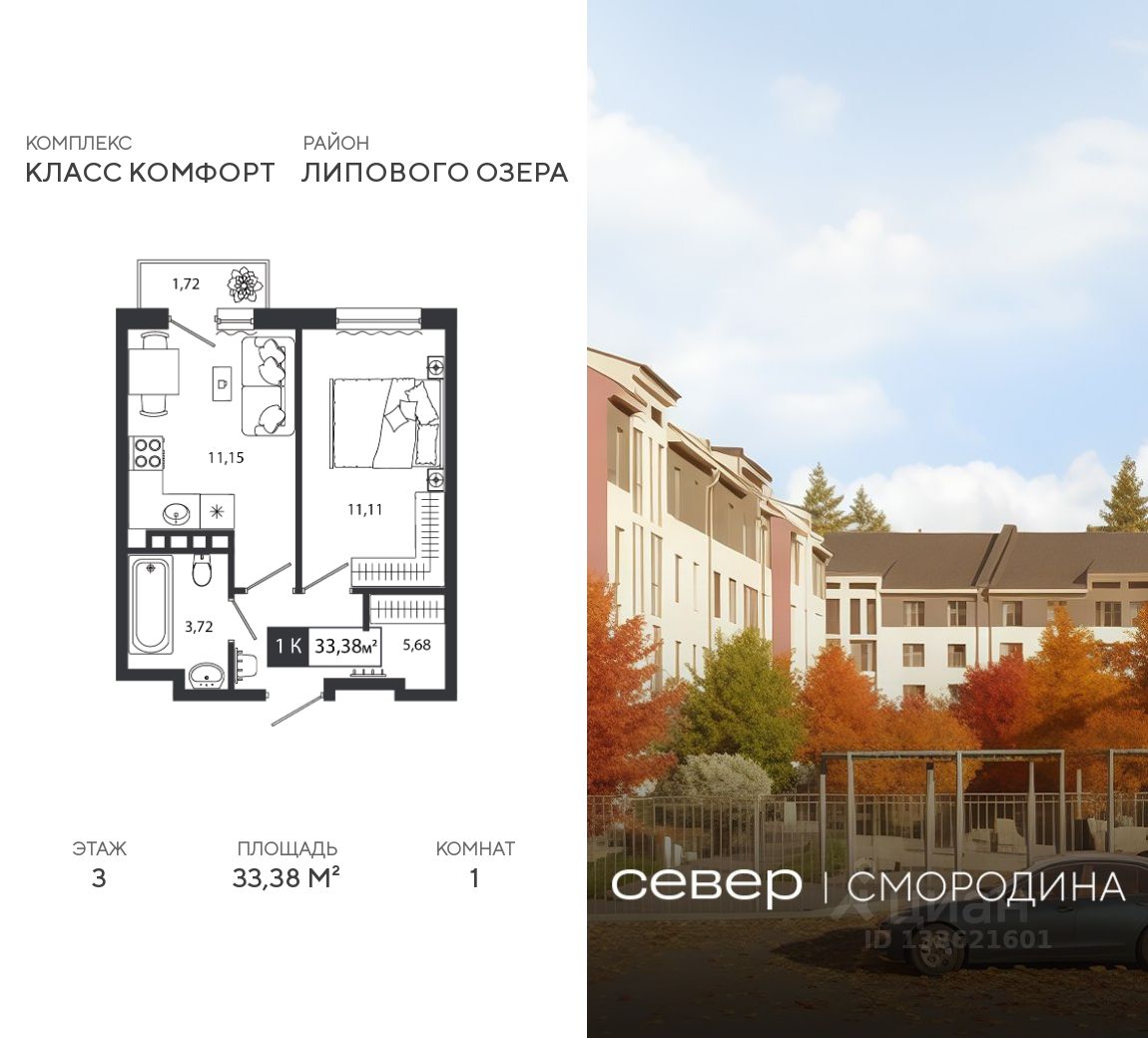 Продаётся квартира площадью 33.38 м2 в жилом комплексе "Смородина". Квартира находится на 3 этаже, жилая площадь квартиры 11.11 м2, площадь просторной кухни — 11.15 м2. Среди особенностей планировки — изолированные комнаты с окнами на одну сторону, 1 совмещённый санузел.