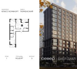 Продаётся квартира площадью 90.63 м2 в жилом комплексе "Дабл-Дабл". Квартира находится на 1 этаже, жилая площадь квартиры 42.46 м2, площадь просторной кухни — 13.54 м2. Среди особенностей планировки — изолированные комнаты с окнами на одну сторону, 1 совмещённый санузел.