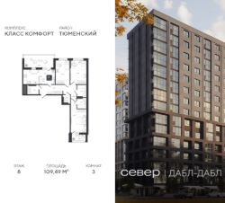 Продаётся квартира площадью 109.49 м2 в жилом комплексе "Дабл-Дабл". Квартира находится на 8 этаже, жилая площадь квартиры 44.43 м2, площадь просторной кухни — 17.86 м2. Среди особенностей планировки — изолированные комнаты с окнами на одну сторону, 1 совмещённый санузел.