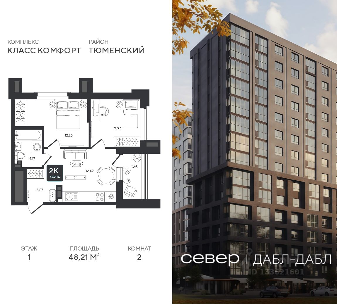 Продаётся квартира площадью 48.21 м2 в жилом комплексе "Дабл-Дабл". Квартира находится на 1 этаже, жилая площадь квартиры 22.15 м2, площадь просторной кухни — 12.42 м2. Среди особенностей планировки — изолированные комнаты с окнами на одну сторону, 1 совмещённый санузел.