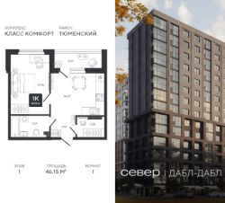 Продаётся квартира площадью 46.15 м2 в жилом комплексе "Дабл-Дабл". Квартира находится на 1 этаже, жилая площадь квартиры 14.96 м2, площадь просторной кухни — 14.69 м2. Среди особенностей планировки — изолированные комнаты с окнами на одну сторону, 1 совмещённый санузел.