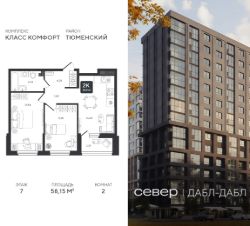 Продаётся квартира площадью 58.15 м2 в жилом комплексе "Дабл-Дабл". Квартира находится на 7 этаже, жилая площадь квартиры 25.86 м2, площадь просторной кухни — 16.08 м2. Среди особенностей планировки — изолированные комнаты с окнами на одну сторону, 1 совмещённый санузел.