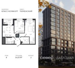 Продаётся квартира площадью 54.51 м2 в жилом комплексе "Дабл-Дабл". Квартира находится на 8 этаже, жилая площадь квартиры 26.28 м2, площадь просторной кухни — 10.27 м2. Среди особенностей планировки — изолированные комнаты с окнами на одну сторону, 1 совмещённый санузел.