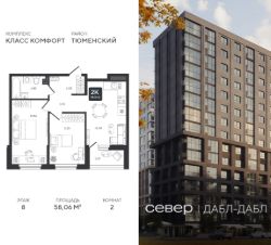 Продаётся квартира площадью 58.06 м2 в жилом комплексе "Дабл-Дабл". Квартира находится на 8 этаже, жилая площадь квартиры 25.86 м2, площадь просторной кухни — 16.08 м2. Среди особенностей планировки — изолированные комнаты с окнами на одну сторону, 1 совмещённый санузел.