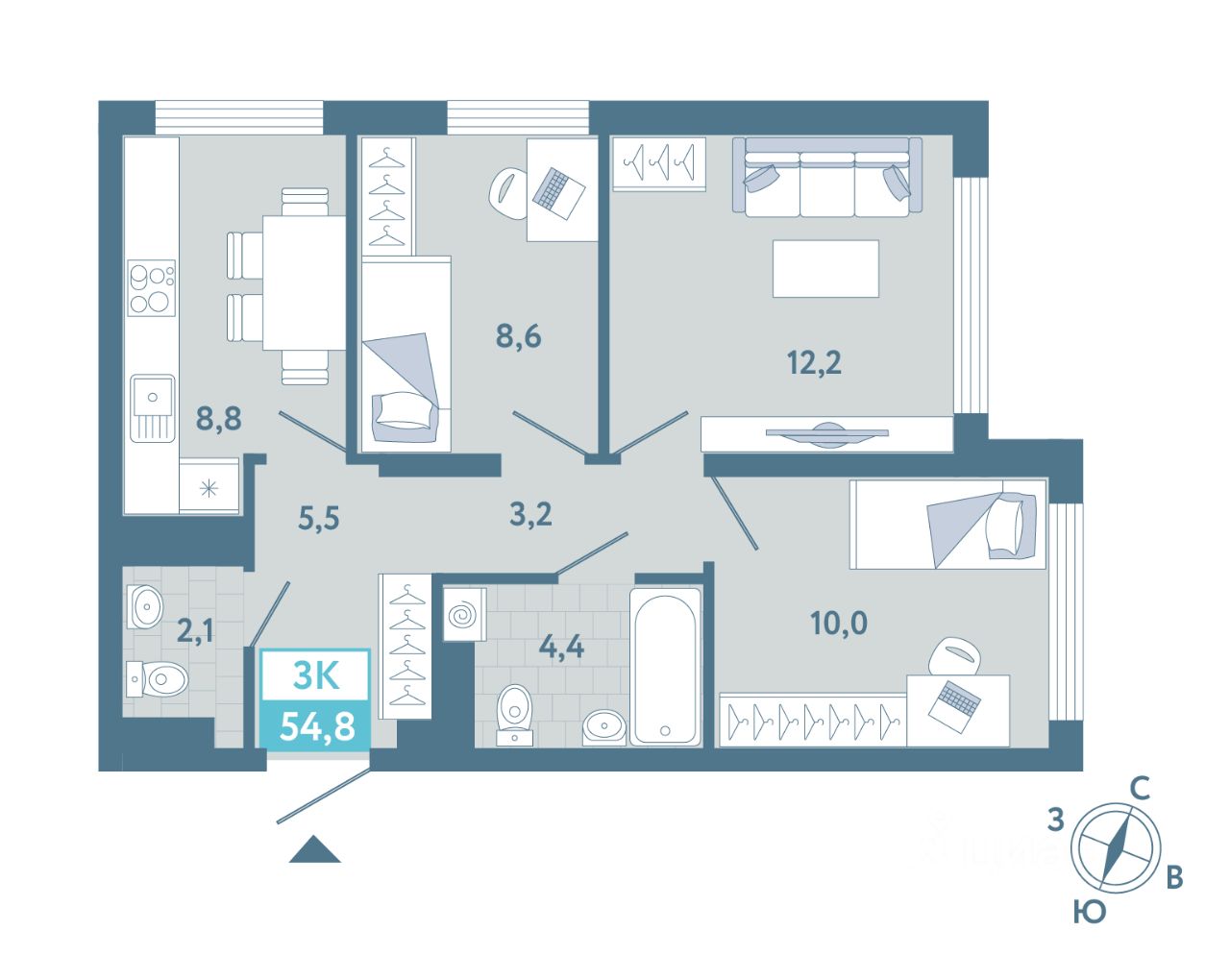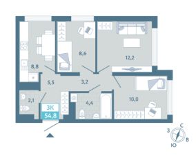 Общая площадь54,8 м²