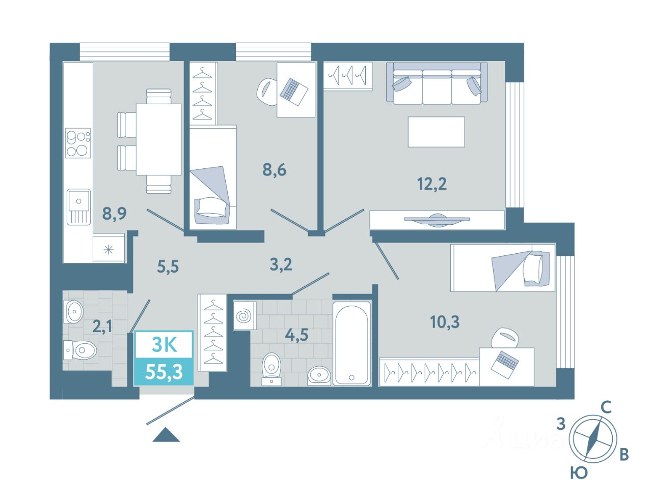 Общая площадь55,3 м²
