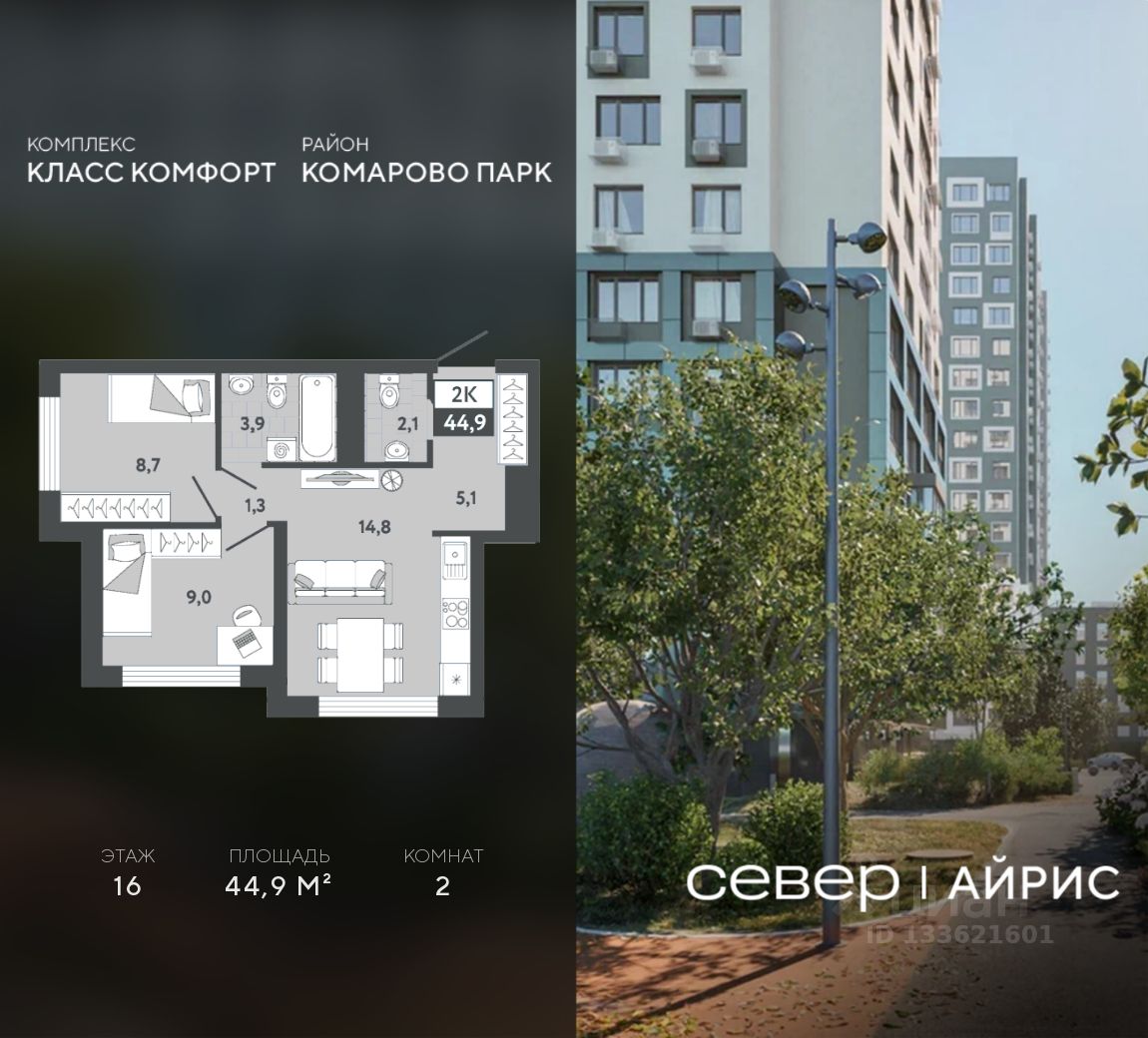 Продаётся квартира площадью 44.9 м2 в жилом комплексе "Айрис".
