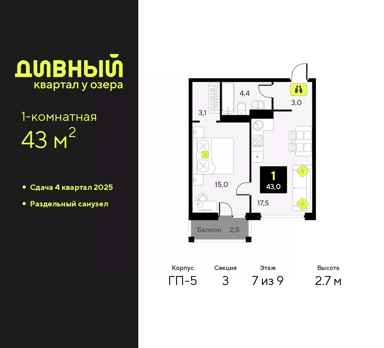 1-комн. квартира в ЖК "Дивный квартал у озера" на 7 этаже. Общая площадь: 43 кв.м. Высота потолков 2.7 м.