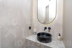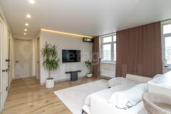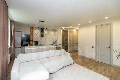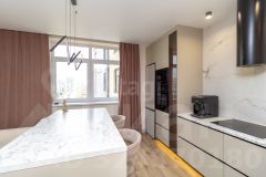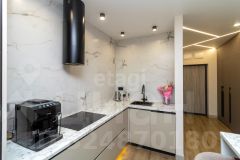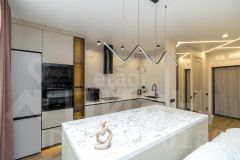 В кухне-гостиной установлен стильный и большой кухонный гарнитур с современными фасадами, где готовить одно удовольствие.
