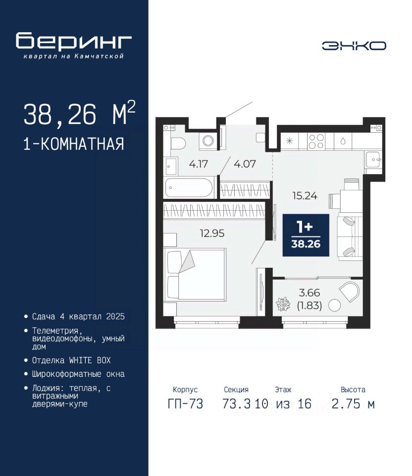 Просторная 1-комн. квартира в ЖК "Беринг" на 10 этаже. Квартира без отделки, полностью готова к чистовой отделке и дальнейшему ремонту. Общая площадь: 38.26 кв.м., жилая: 12.95 кв.м., площадь просторной кухни-столовой: 15.48 кв.м. Все окна выходят на одну сторону. В квартире одна лоджия, один совмещенный санузел. Высота потолков 2.75 м.