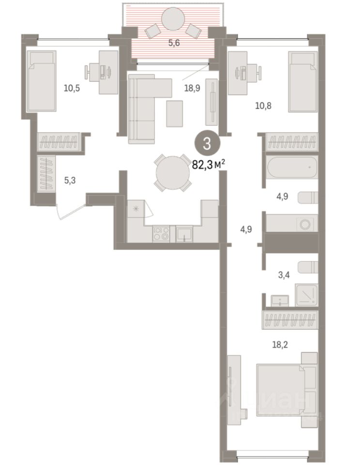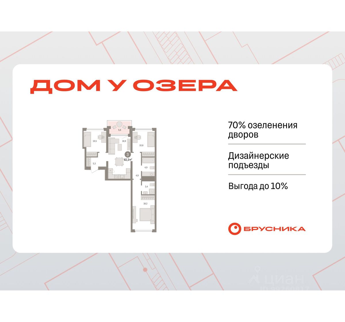 Трехкомнатная квартира с предчистовой отделкой в ЖК "Дом у озера" на 2 этаже. Общая площадь: 82.34 кв.м., жилая: 39.5 кв.м., площадь просторной кухни-гостиной: 18.9 кв.м. Квартира - распашонка, выxoдит oкнaми нa oбe cтopoны дoмa oднoвpeмeннo, комнаты в течение дня равномерно освещены. В квартире один балкон, два совмещенных санузла. Высота потолков 2.7 м.