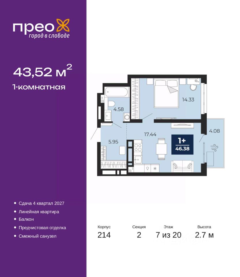 Однокомнатная квартира с предчистовой отделкой в ЖК "Прео" на 7 этаже. Общая площадь: 43.52 кв.м., жилая: 14.33 кв.м., площадь просторной кухни-столовой: 17.44 кв.м. Все окна выходят на одну сторону. В квартире один балкон, один совмещенный санузел. Высота потолков 2.7 м.