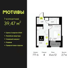 Продается 1-комн. квартира от застройщика с предчистовой отделкой в ЖК "Мотивы" на 4 этаже. Общая площадь: 39.47 кв.м., жилая: 12.37 кв.м., площадь просторной кухни-столовой: 13.53 кв.м. Все окна выходят на одну сторону. В квартире одна лоджия, один совмещенный санузел. Высота потолков 2.7 м.