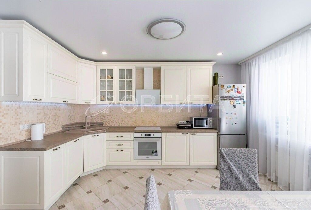Просторная кухня-гостиная: Светлое и большое пространство с выходом на застеклённую лоджию. Идеально для вечеров в кругу семьи и приёма гостей.